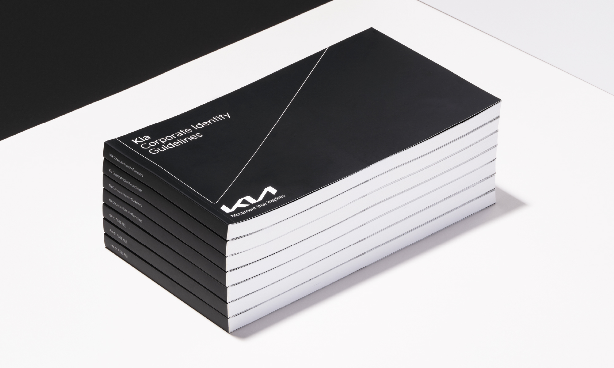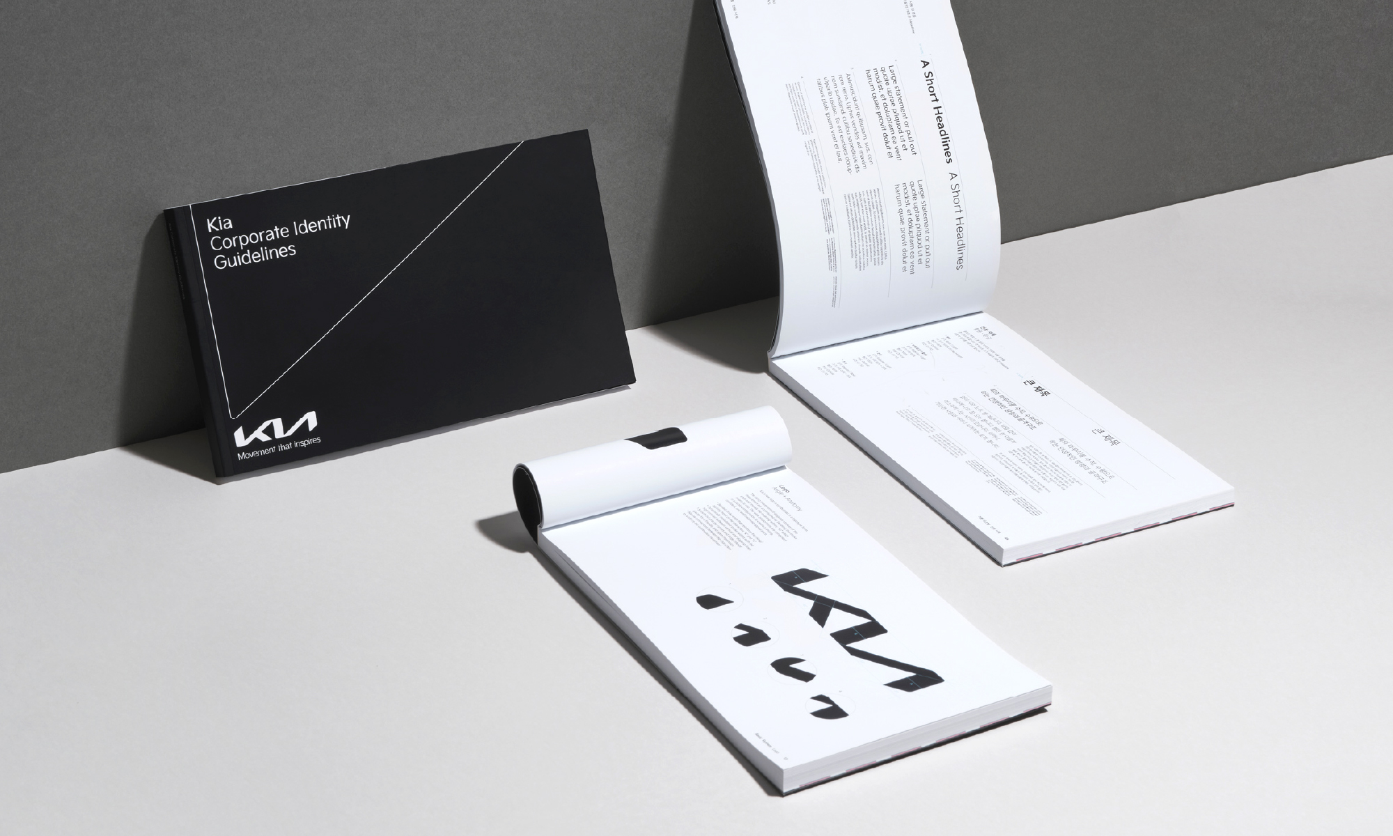 기아 로고의 상승하는 라인들을 활용한 그래픽모티프는 브랜드의 개성과 미래지향적 방향성을 시각화합니다. 세 가지 유형으로 파생되는 그래픽모티프는 시스템 규정에 따라 매체의 크기와 형태에 맞춰 체계적으로 운용됩니다.