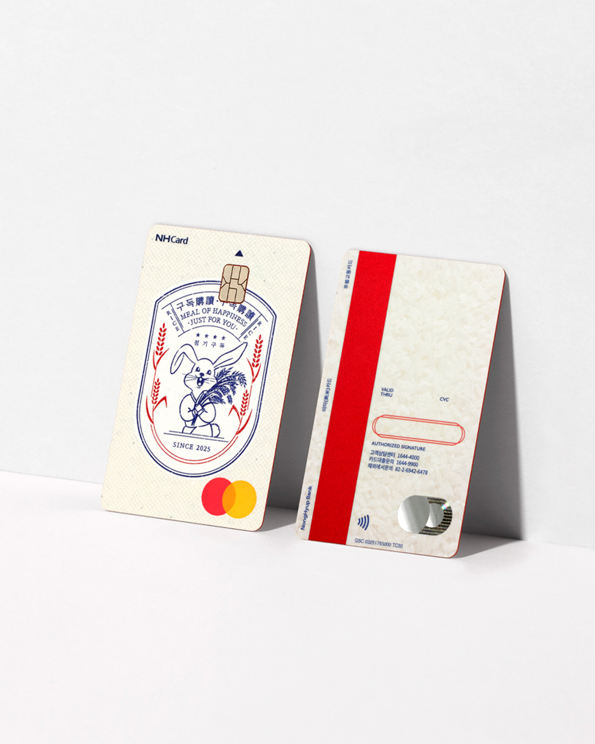 ‘구독구독미’ 디자인은 쌀포대를 연상시키는 그래픽을 통해 ‘쌀 구독’ 카드의 본질을 드러냅니다. 또한 농협의 마스코트인 토끼 캐릭터의 라인 드로잉을 활용해 농협의 헤리티지를 자연스럽게 녹여내고, 풍요로운 수확의 이미지를 현대적인 감각으로 재해석했습니다.